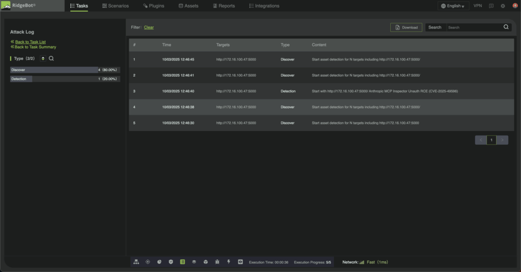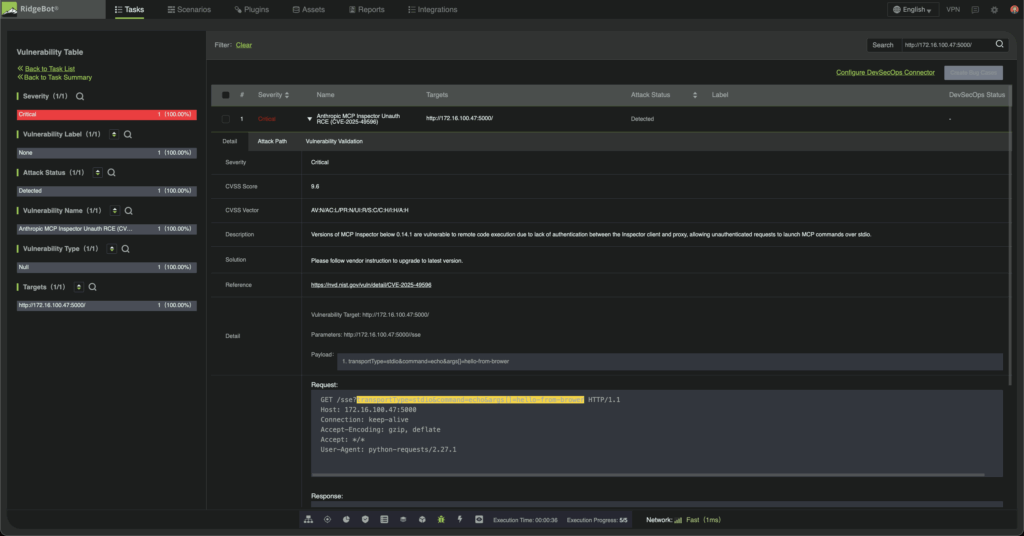 RidgeBot addresses this threat with automated detection that compresses security validation from weeks to hours. Specialized plugins simulate the complete attack chain, reconnaissance through exploitation, identifying vulnerable MCP Inspector instances and providing detailed evidence before threat actors can weaponize them.