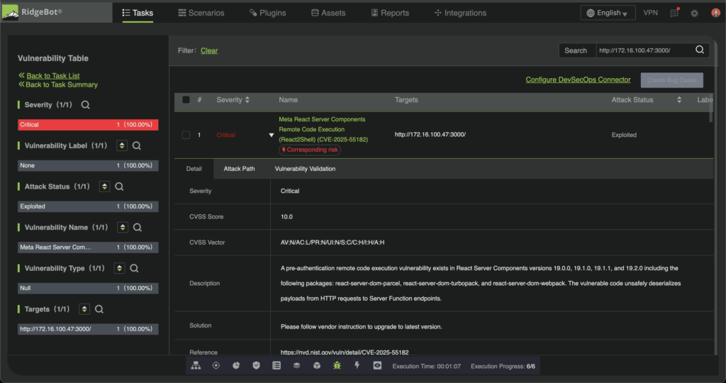 This method mirrors real attacker actions, but under controlled conditions that eliminate false positives entirely. If RidgeBot confirms the callback, exploitation is real. If it doesn’t, the system is not exploitable. Security teams get clarity, not guesswork.