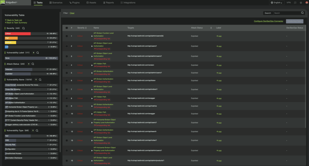 RidgeBot API Security Testing provides a practical solution. It helps organizations identify and safely exploit potential API vulnerabilities in a controlled environment. RidgeBot supports both black-box testing, where no credentials are provided, and gray-box testing, simulating an attacker with partial authenticated access. By evaluating both the scope of individual tokens and the business logic governing API workflows, RidgeBot provides comprehensive coverage of potential risks. It detects web vulnerabilities, uncovers flaws in business logic, and continuously tests API behavior to help ensure that even if a token is compromised, its potential misuse is sharply limited.
